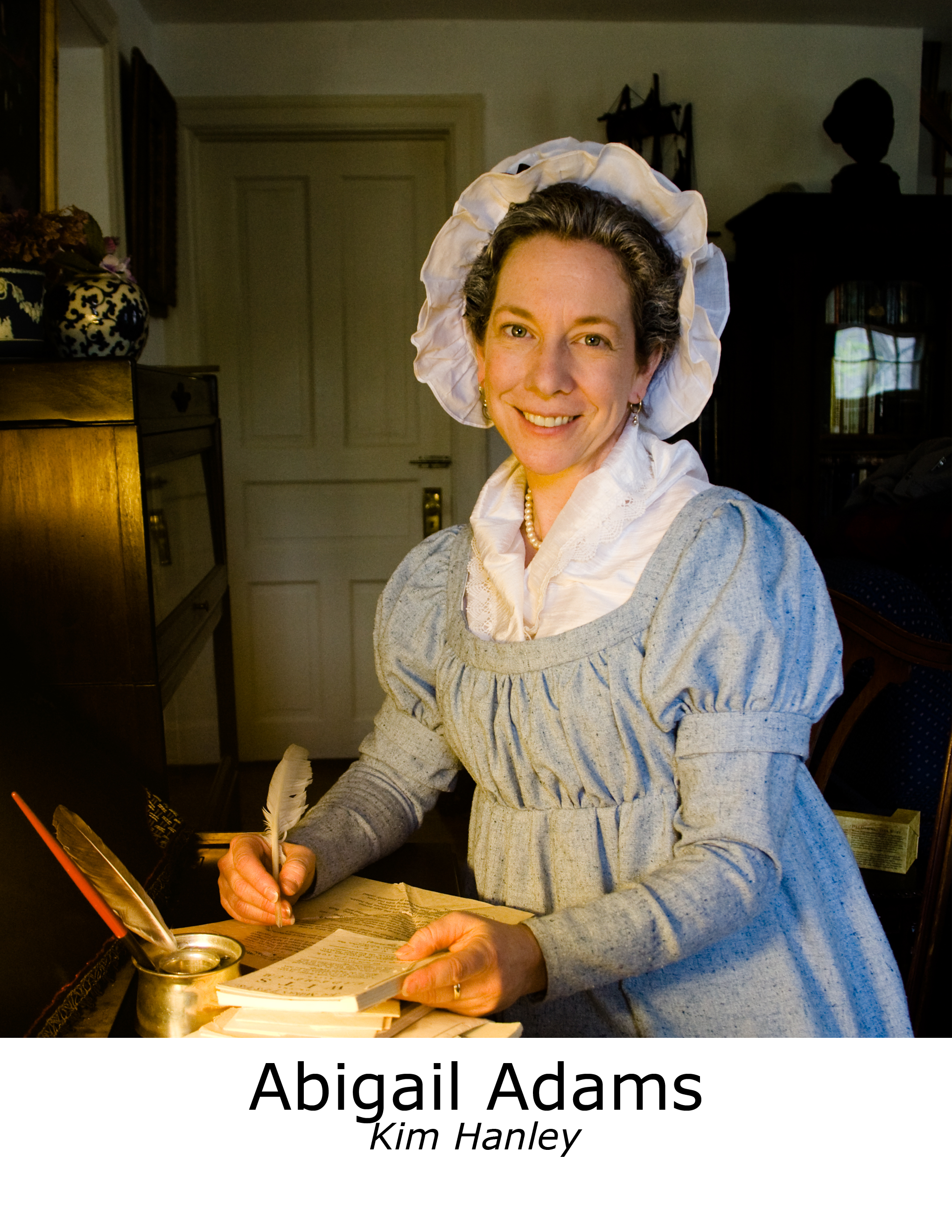 In addition to Abigail Adams, Kim’s character portrayals include: Dorothy Quincy Hancock, Annie Oakley, Harriet Beecher Stowe, Lucretia Mott, Elizabeth Cady Stanton, Mary Young Pickersgill, Betsy Ross, Molly Pitcher, Eliza Goodfellow, Allice Roosevelt Longworth, Abby Aldrich Rockefeller, and Grace Coolidge. Upcoming Projects include Mother Jones!